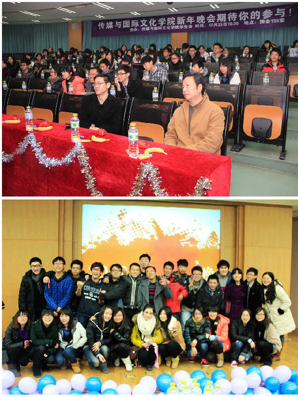 2011年12月26日,星期五,浙江大学传媒与国际文化学院新年晚会在紫金港国会召开。学院党委书记吕国华老师,新闻系主任李岩老师,学院韦路、张丽萍老师,团委副书记刘岩老师出席了本次晚会,并与学院所有同学一同度过了一个欢乐的夜晚。