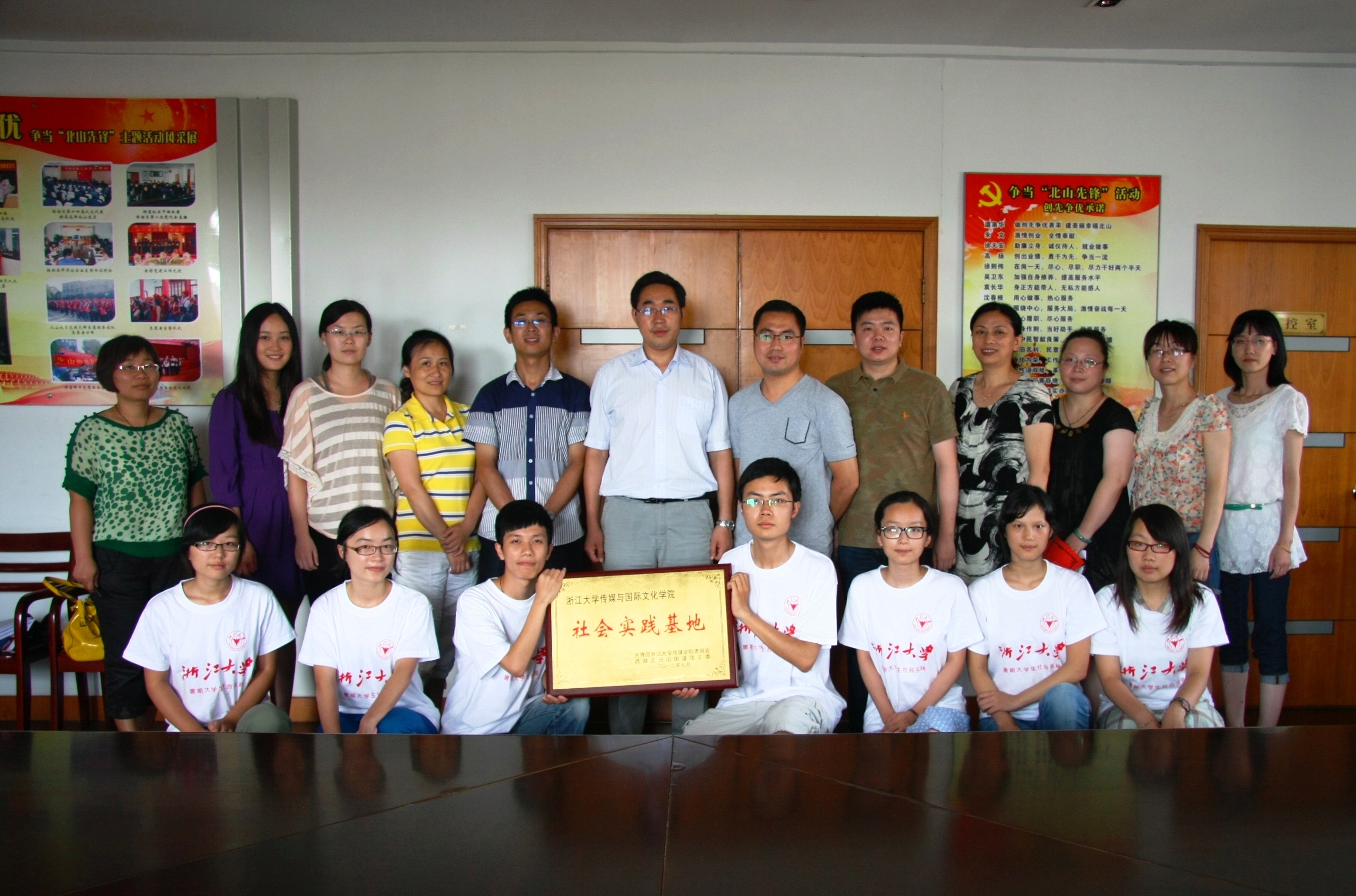 会议伊始,浙江大学传媒与国际文化学院挂职团委副书记赵琳简要地介绍了本次挂职概况。接着,由传媒与国际文化学院团委和北山街道团工委领导共同为社会实践基地揭牌。