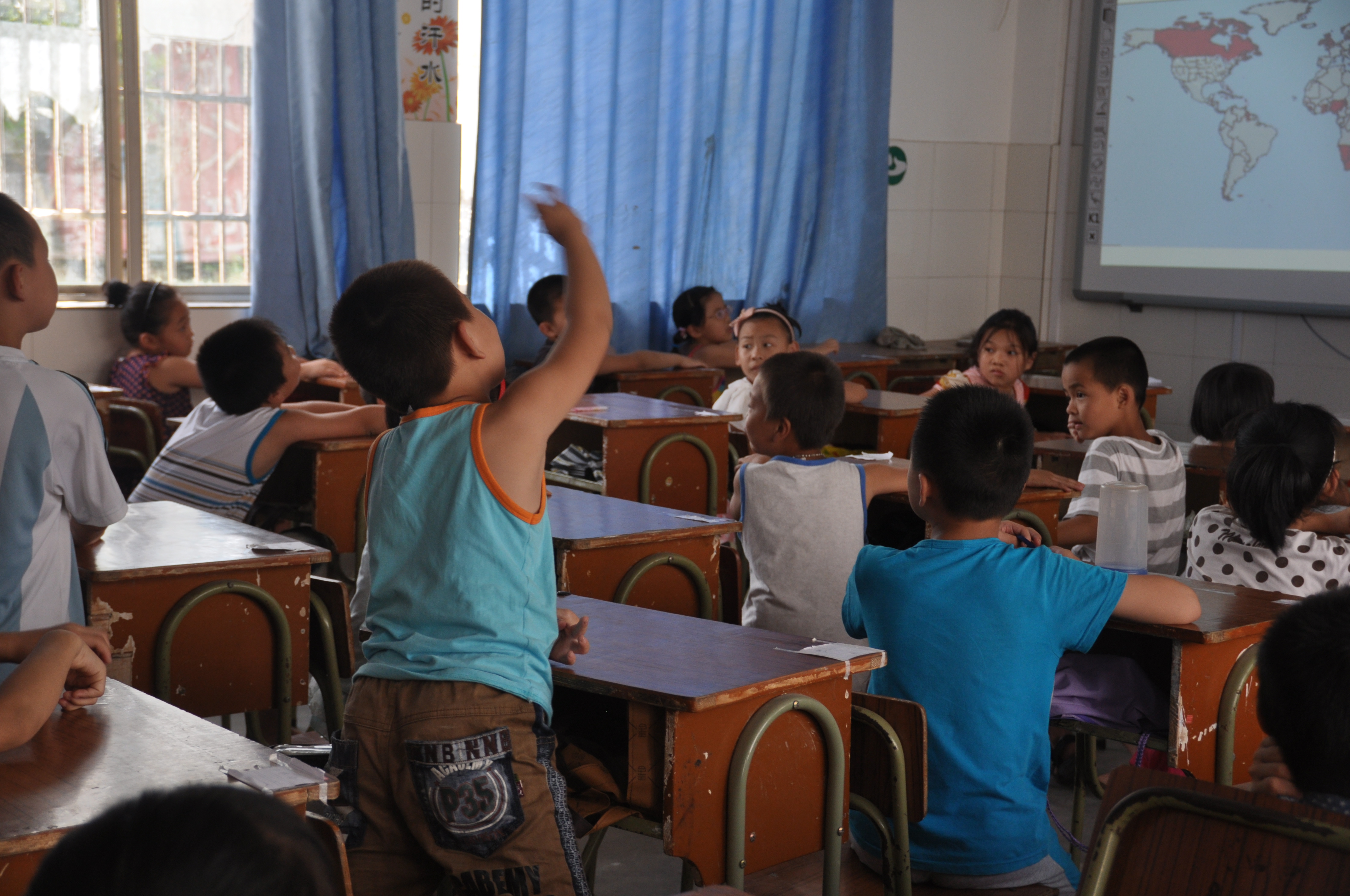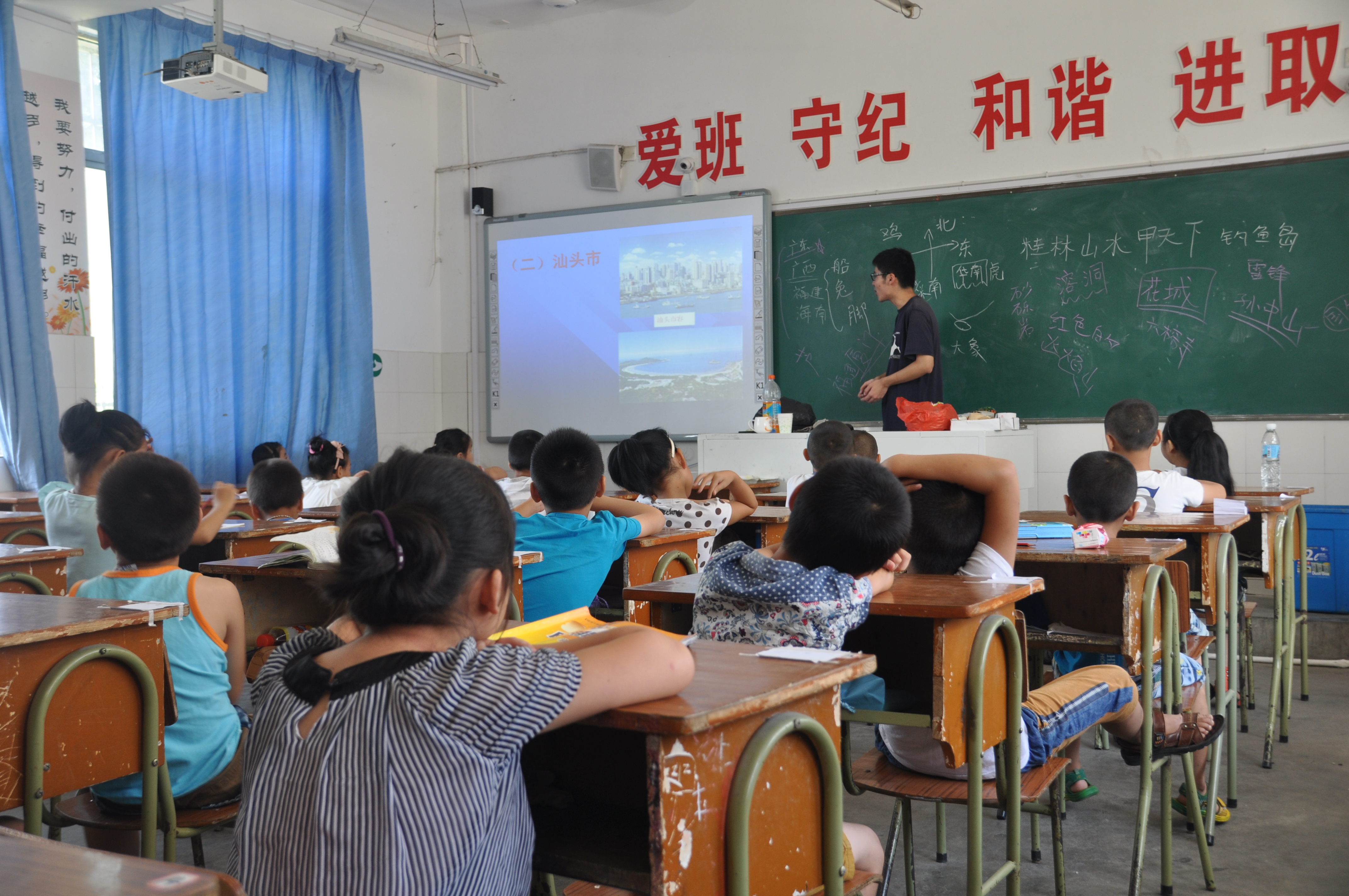 上午8点半,孩子们都到齐之后,我们开始上课,首先带给孩子们的是地理课。地理组的黄耀德同学结合PPT给孩子们讲了中国华南地区的地形特征和各地的当地的风俗美食。文字介绍加上老师的讲解,使得孩子们以一种新的视野了解了外面的世界。如果说上午的课程为孩子们打开了一扇了解中国的窗户的话,而下午2点开始的历史课,则可以说是为孩子们打开了一扇了解世界的窗户。下午的历史课由历史组的黄震宇同学为孩子们讲解,课程以奥运会为线索,以奥运会的举办地为切入点,展现世界各地的大学,风俗民情等等。同时与孩子们互动更是起到了调节课堂氛围的作用。