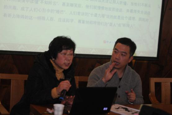 浙江图书馆官员温斌用手语发言(右),浙江特殊教育学院周和音老师翻译(左)