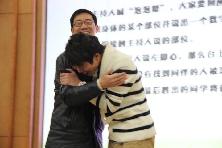 互动环节第一个游戏——“泡泡堂”中,师生同台上场进行游戏。尤其是最后需要将彼此的肚子碰到一起时,韦路老师和场上一位男生快速转过身来抱成一团,平日里严肃的老师此时的可爱形态让大家忍俊不禁。