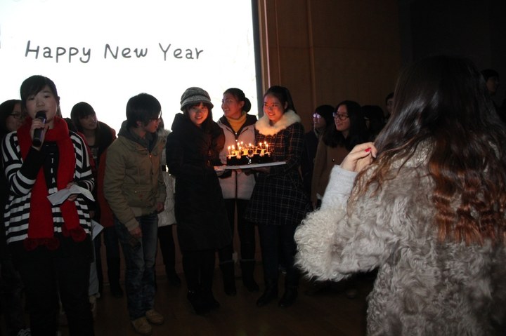 在大家的欢笑、游戏和表演中,时间飞快地过去了。在晚会结束之前,传媒学生会大家庭的成员们上台为大家献上了一曲《相亲相爱一家人》,同时,场下推出蛋糕,点燃蜡烛,为这不一般的新年而庆祝。