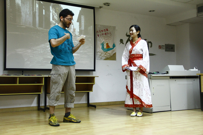 为营造端午节的氛围,426的墙壁上以粽子叶、香囊、蛋络等充满端午气息的元素装饰。来自2013级硕士班的巴西留学生霍德力和2011级对外汉语本科班的陈丽丽同学担任本次活动的主持人,他们分别穿着现代服饰与汉服,演绎了一段“穿越”的故事来带领参与者们领略了端午节的历史。
