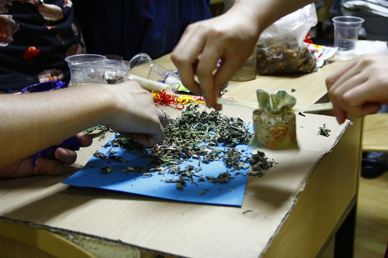 完成了各轮比赛之后,各组开始用他们在比赛中获得的香囊材料制作香囊。其实,无论是在场的中国学生还是留学生,对于制作和佩戴香囊这一端午节习俗都极少亲身体验,所以这次活动的香囊制作活动对于他们来说非常新奇。中国学生向留学生讲解制作香囊所用的中药材的作用,留学生为中国学生香囊的配色出主意。用中药材、棉花制作成的香囊散发的气味与平时能够买到的香囊成品并不相同,同学们之间都好奇地闻着彼此香囊的气味。在这个夜晚制作的香囊不仅可以驱赶蚊虫,也可以见证活动里大家相互之间培养的情感。