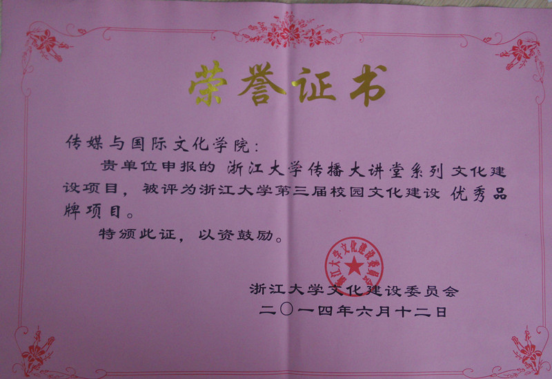 2014年6月12日,由吴飞院长负责的我院“浙大传播大讲堂”文化建设项目,被浙江大学文化建设委员会评为浙江大学第三届校园文化建设优秀品牌项目。