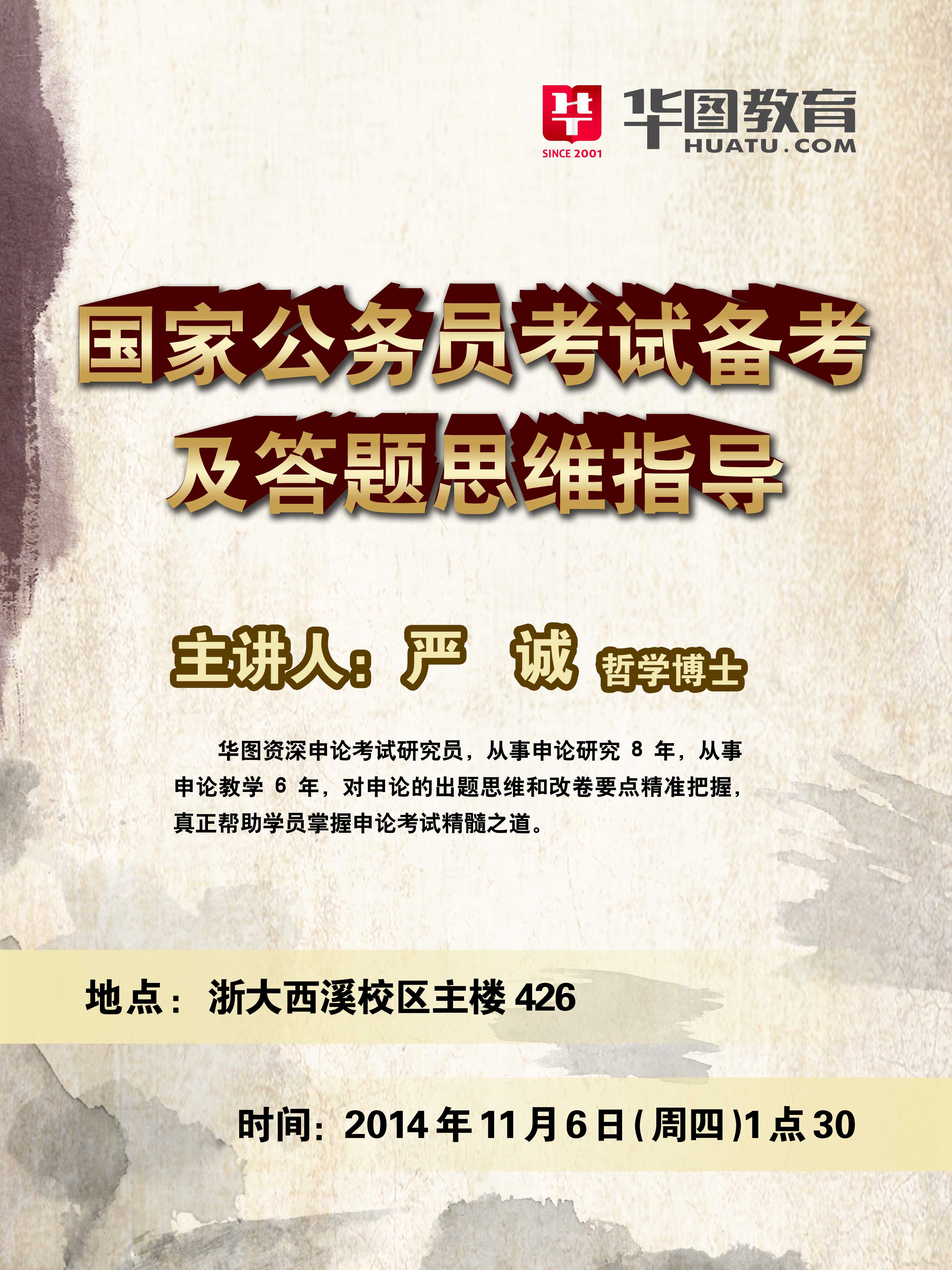 11月6日下午两点半,由华图资深申论考试研究员严诚博士带来的公务员主题讲座在浙江大学西溪校区田家炳501顺利召开。本次讲座的主题为国家公务员考试备考及答题思维指导。