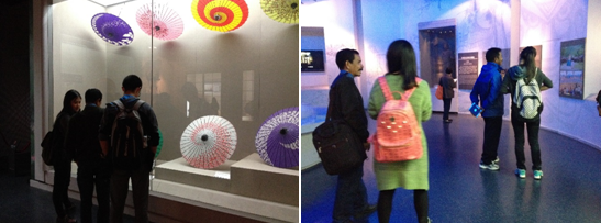 在近一个小时的参观过程中,同学们对中国伞的起源有了一定的了解,欣赏了古时美丽的油纸伞、油布伞以及美丽的西湖绸伞。此外,在“伞的文化”展厅,同学们还发现了伞的形态、颜色,甚至汉字字形,其背后都蕴含着独特的文化意义。伞与制度、地方风俗也有着密切的联系,伞可以是仪仗制度的一部分,又是将具有共同心愿的人联系在一起的媒介;伞可以给人们带来欢喜吉祥,有时又成为了民俗心态中的一种难言的禁忌……