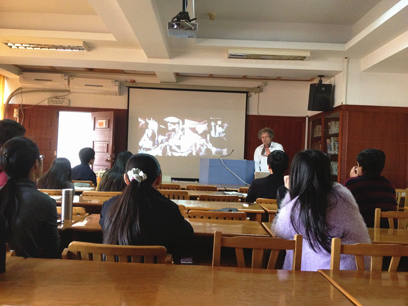 由于对戏剧表演颇有研究心得,Daniel十分擅长运用科学表演的形式来谈论严肃的科学,在讲座中他用科学的方法解读了梵高、毕加索等人艺术作品中的图像、线条的意义和内涵,给大家带来一场生动的艺术盛宴。接着Daniel比较了两幅不同时期描绘福岛的海浪的图片,从图片的不同的呈现中可以清晰看出科学出现之后带来的巨大变化,他还和大家探讨了广岛人民如何运用各种物品来表达对被原子弹袭击的广岛的哀思和对和平的祈祷。