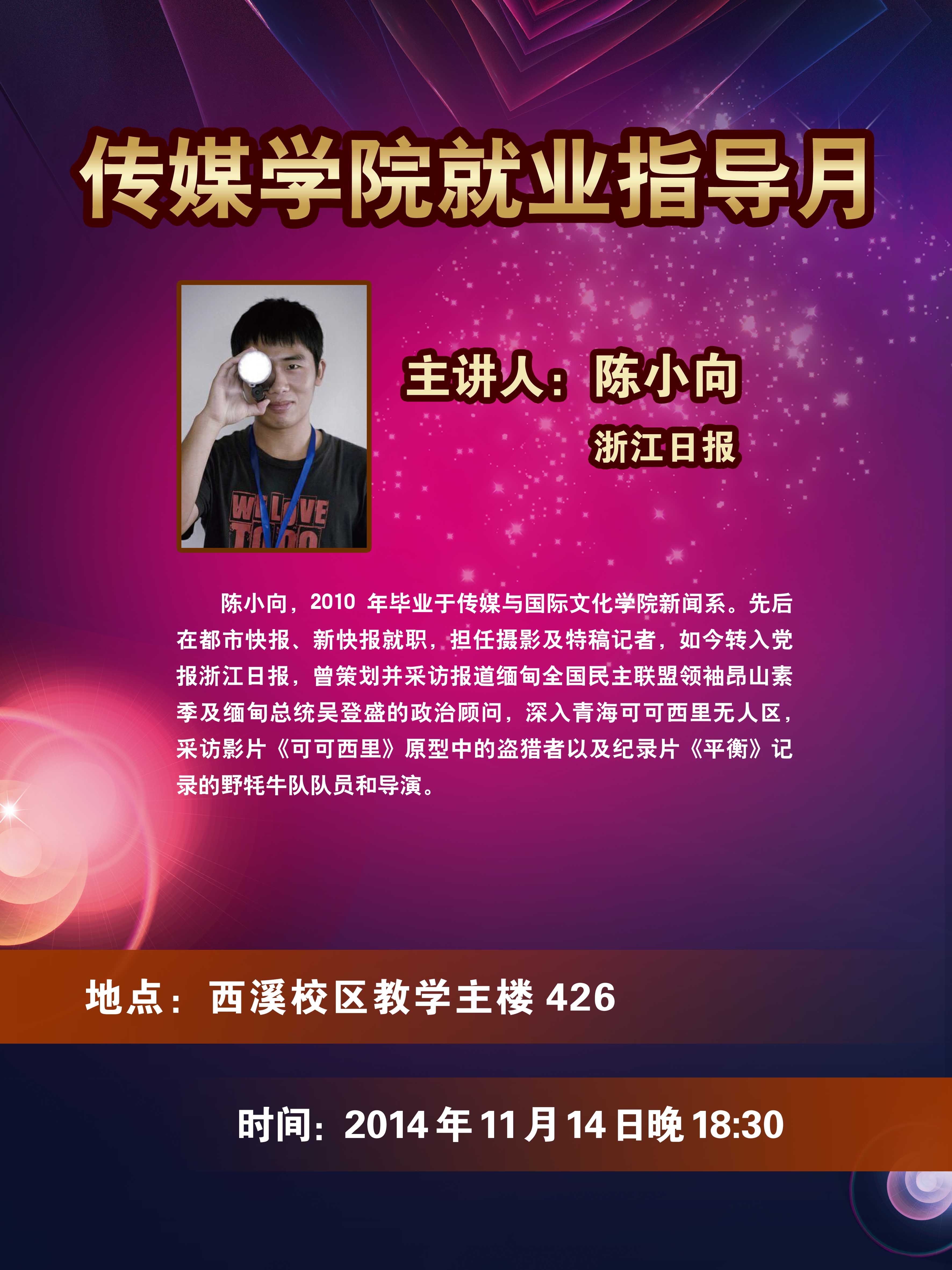 11月14日晚七点半,由传媒学院毕业的优秀学长陈小向带来的纸媒主题讲座在浙江大学西溪校区教学主楼426顺利进行。