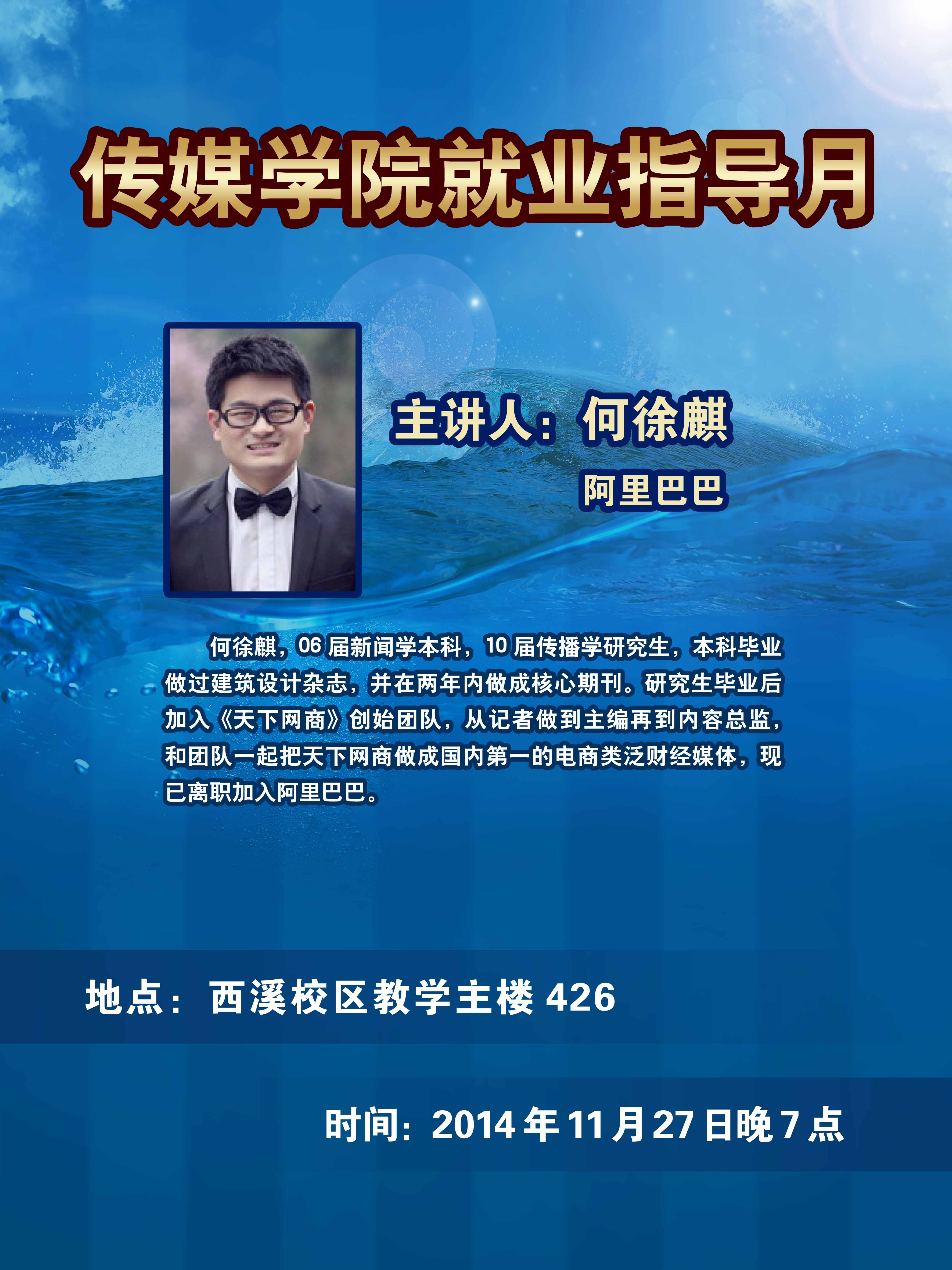 11月27日晚7点,就业指导月系列讲座最后一场即电商主题讲座在浙大西溪校区主楼426顺利召开。本次讲座的主讲人何徐麒为浙江大学传媒与国际文化06届新闻学本科,10届传播学研究生。本科毕业后曾做过建筑设计杂志,并在两年内将其做成核心期刊。研究生毕业后加入《天下网商》创始团队,从记者做到主编再到内容总监,和团队一起把天下网商做成国内第一的电商类泛财经媒体,现已离职加入阿里巴巴。