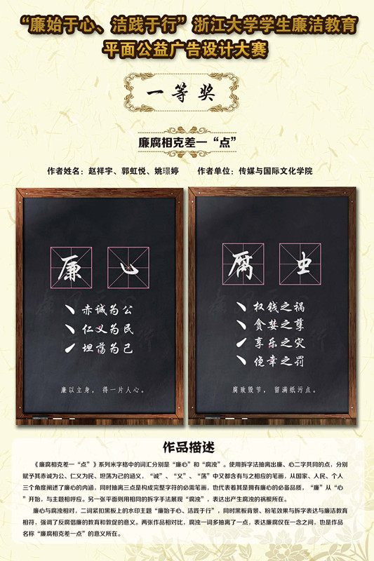 12月1日,由浙江大学校廉洁教育和廉政文化建设工作领导小组与传媒学院共同主办的以“廉始于心、洁践于行”为主题的浙江大学学生廉洁教育平面公益广告设计大赛顺利结束。本次比赛评出获奖作品21件。其中一等奖1件,二等奖2件,三等奖6件,优胜奖11件,一等奖廉腐相克差一“点”获得评委一致好评。