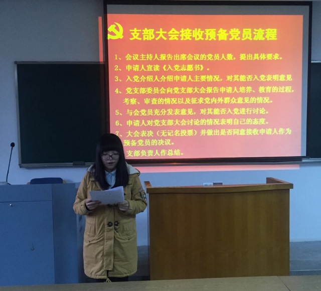 大会第一项由主持人洪斐报告出席会议的党员人数,提出会议的具体要求,宣布支部大会会议流程和接收预备党员的主要程序。第二项由申请人李玥宣读《入党志愿书》中由本人填写的内容,再次表明了自己积极要求加入中国共产党的决心。第三项由入党介绍人洪斐和胡烈飞介绍李玥的主要情况,并表示同意接收李玥同志成为预备党员。第四项由党支部委员会报告李玥培养、教育的过程,考察、审查的情况以及征求党内外群众意见的情况。第五项由与会党员充分发表意见,对李玥是否能入党进行讨论。胡晓欣同志认为李玥同志作为班长在工作和学习上都表现出色;陈鸳鸳同志认为李玥同志工作积极,团结同学;张靓同志表示李玥同志积极向党组织靠拢,并能严格要求自己。第六项,李玥同学再次表明将以更高的标准严格要求自己,并虚心采纳党员们提出的意见和建议。大会第七项,全体党员采取无记名投票的形式对于李玥同志能否成为预备党员进行投票表决,表决结果为到会五名党员全票通过。