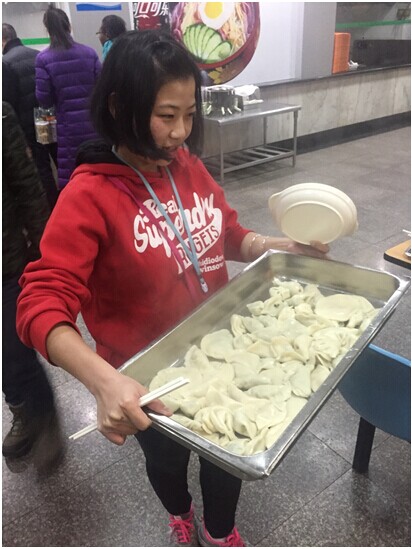桂珠在包饺子比赛中获胜。然后就进入下一个环节,吃饺子比赛。大家把包好的饺子排队送去窗口煮。