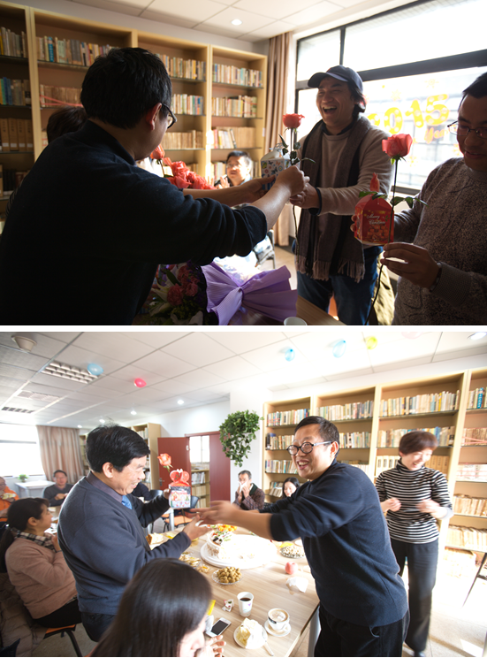 为建设温馨、融洽的学院文化氛围,传媒学院工会于2014年10月25日中午策划组织了一场热闹而温馨的教职工集体生日会,此次集体生日会在传媒学院新建成的鸽子屋书吧举办。生日会开始,吕国华书记向到会的教师们送上生日祝福,并请两位新加入学院的教师作了自我介绍,最后由吴飞院长向每位参加生日会的老师送上精心准备的鲜花和小礼物。通过此次集体生日会,促进了不同专业老师们的交流,传递了学院对老师们的祝福和感谢。