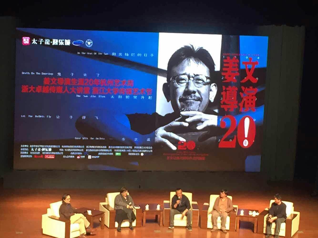 现场对话的嘉宾除了导演姜文,还有金马奖评委会主席焦雄屏、浙江大学传媒与国际文化学院教授胡志毅、北京电影学院教授苏牧、浙江广电集团制片人肖凡。