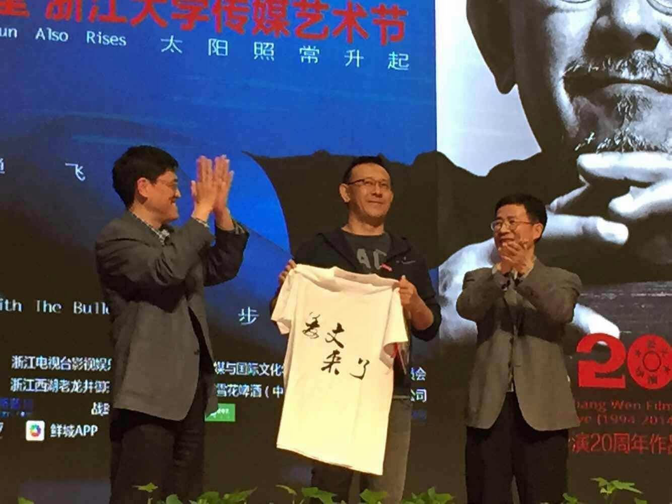 首先,传媒与国际文化学院院长吴飞教授向同学们介绍了姜文导演艺术20年活动周的情况。浙江大学党委副书记任少波教授代表学校致欢迎辞,并且给姜文导演颁发兼职专家聘书,戴上了浙江大学的校徽,赢得了现场的阵阵掌声。