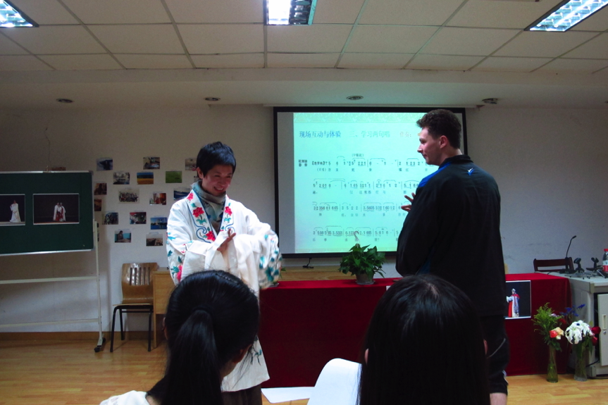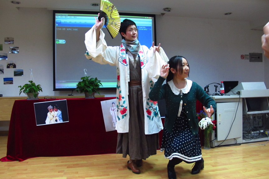 在互动的环节,杨崑老师穿上手工刺绣的戏服,与留学生王博同学合作扮演杜丽娘和柳梦梅,向同学们展示昆曲如何通过身段和水袖的表演演活人物的内心和情感。