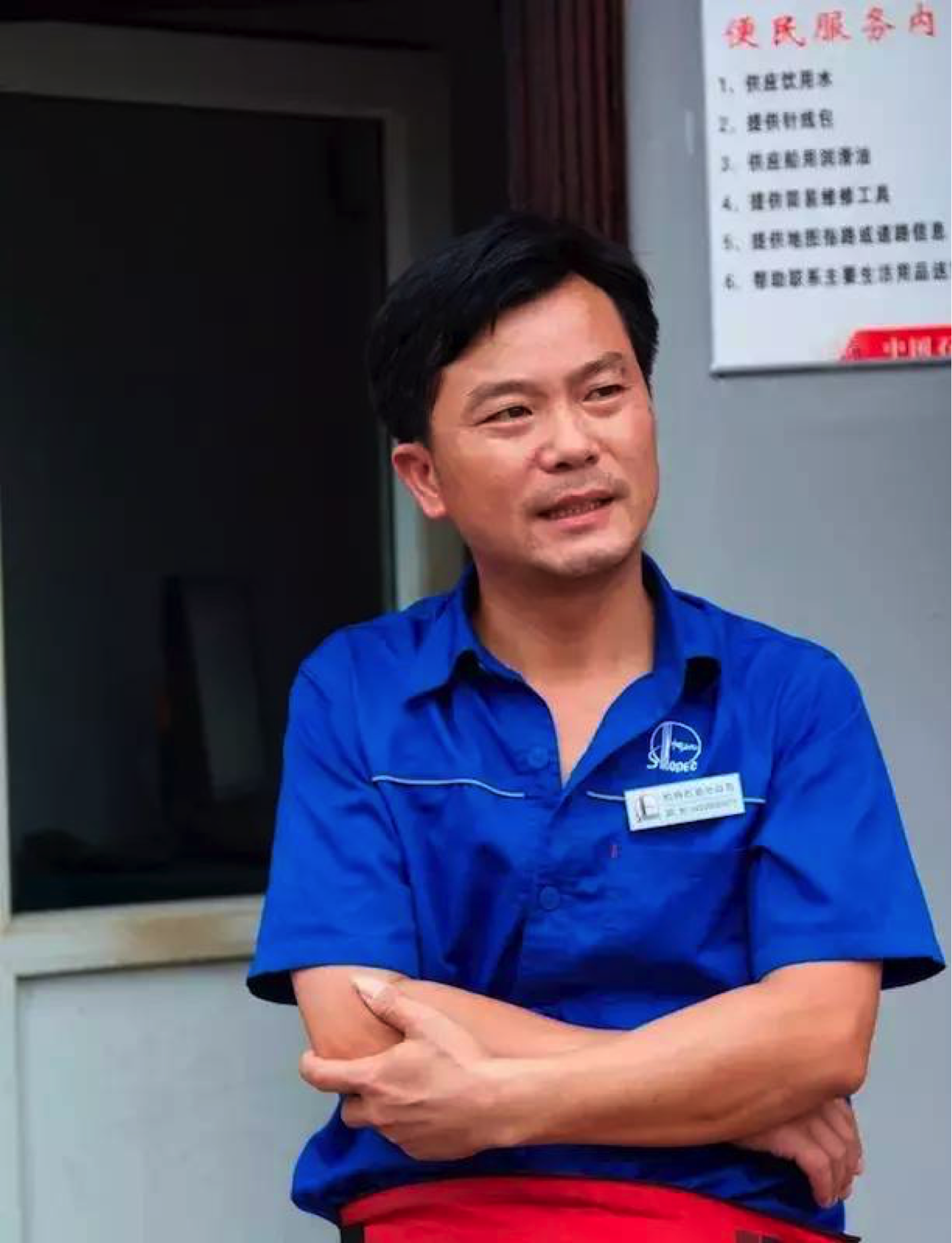 图8:除了市区比较繁忙的加油站点外,还有很多小站也有工作人员在炎炎夏日坚守的身影。三里洋加油站位于京杭大运河边,主要的工作是为来往的船只加油。每天只有零星的几艘船过来加油,整个油站也只有站长萧本发及其妻子两名工作人员,然而他们已经在此坚守了13年,无论寒来暑往、日升月落。