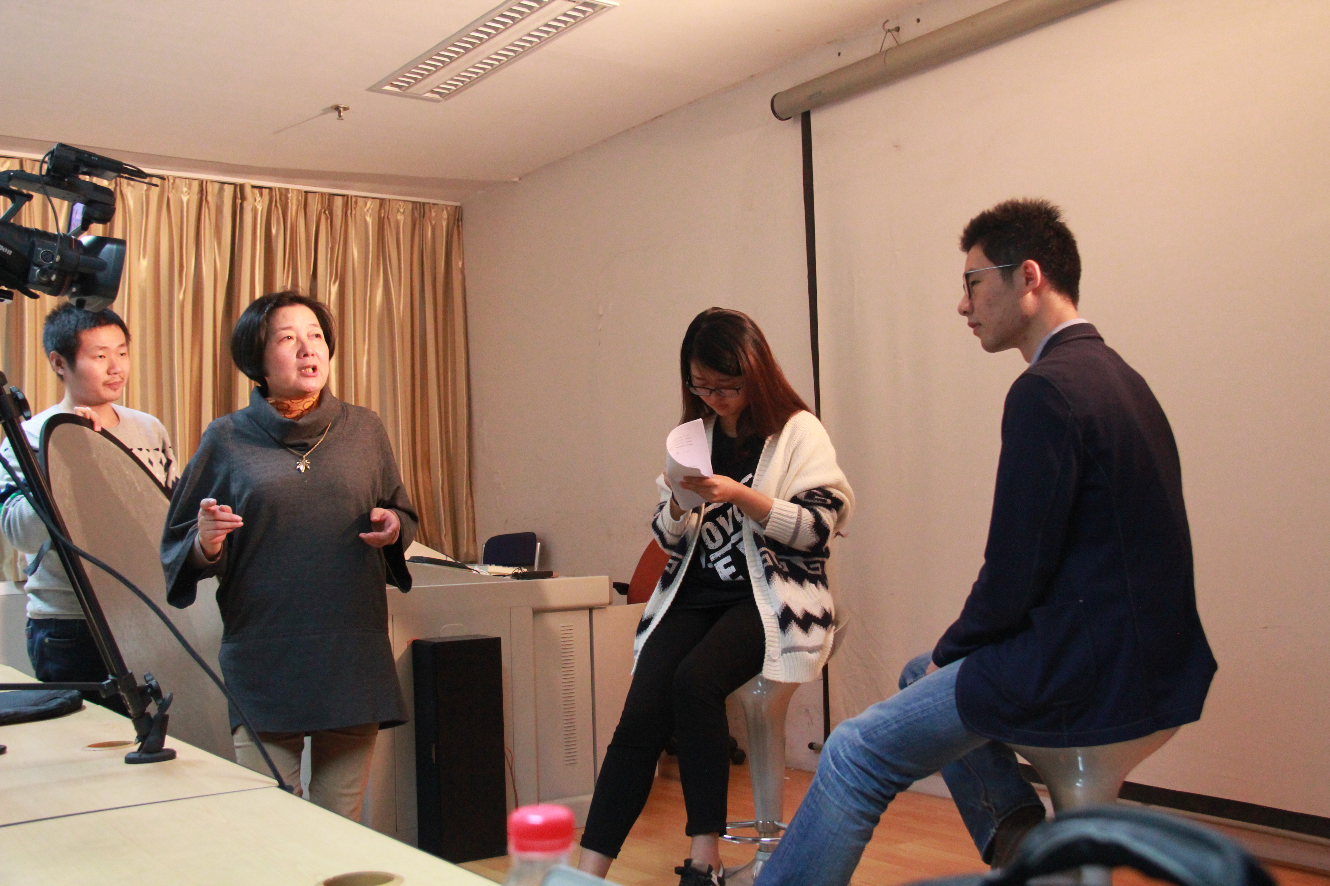 六点刚过,周丽英老师便带着摄像机、话筒、三脚架等设备来到教室,并专注调试机器。