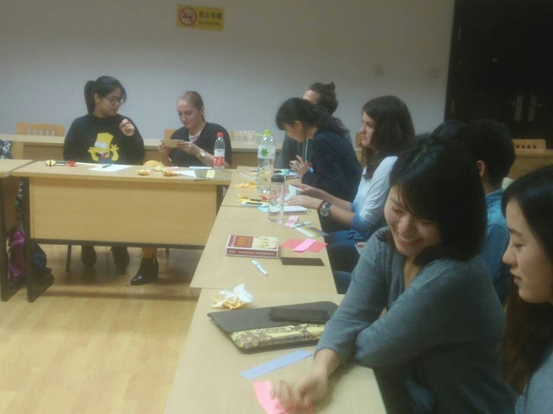 找到了各自的语伴之后,大家相互做了自我介绍。他们的介绍规则是留学生用中文介绍自己的中国语伴,而中国学生则是用英语介绍外国语伴,这很好地锻炼了他们的语言表达能力。接下去他们还进行了一些有意思,但同时也具有挑战性的环节,比如手工折纸。折纸对于中国学生来说,并不陌生,很多学生都会折各种各样的图案或物体,比如纸船、千纸鹤、玫瑰花等等。但是对于留学生来说,折纸是一件比较具有挑战性的活儿。不过最后在中国学生的耐心指导下,大多数留学生都学会了折千纸鹤,折纸成了他们颇有成就感的一件事。