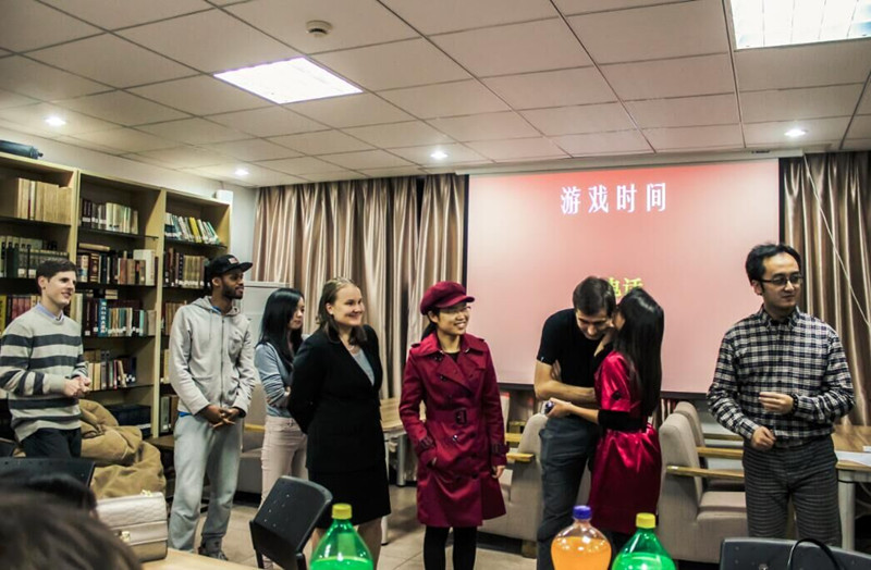 在讨论过后,Hangzhou Plus的组织者、浙大毕业生、来自美国的乔治为大家高歌一曲《小镇姑娘》,将全场的气氛点燃。紧接着,主持人组织大家玩了一个名为“打电话”的传话游戏。大家分为两组进行游戏,输的组将推举出一个代表上台表演,来自法国的Amine给大家表演了舞蹈。大家热情高涨,游戏的过程中笑声阵阵,气氛热烈。在游戏结束后,大家都非常兴奋,干脆自告奋勇上台表演节目,两位法国朋友的法语歌,俄语版《喀秋莎》,一直到九点整,大家还对此依依不舍,围在一起聊了很久才散场。第四期汉语角就在这样活泼轻松的氛围中拉下了帷幕。
