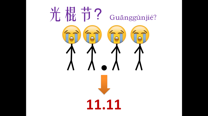 讨论结束后,主持人用有趣的卡通画引出了“光棍节”这个词语,解释了为什么十一月十一日是光棍节,以及光棍节现在发展为购物节的原因。卡通画再加上主持人夸张的手势语,让在座的中外朋友都忍俊不禁,这也充分证明了,手势语是世界人民沟通的桥梁。