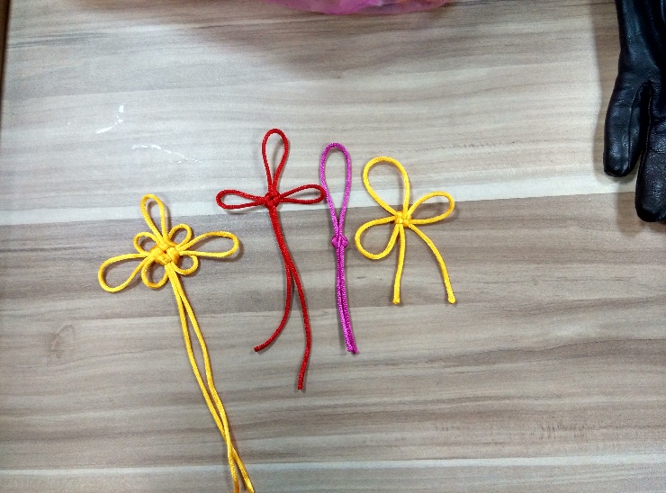 接着是学做万字结,其结体的线条走向与佛门的万字符标志相似得名,寓意万事如意,福寿万代。同心结和万字结都比较简单,后面的三环结对大家来说才是难点。又因为是徒手制作,所以大家都显得非常吃力,不过在一遍又一遍的指导之后,大部分都学会了制作。最后的吉祥结的编织,才是最难学的,只有少部分同学学会,不过对于大部分同学来说,学会了编织同心结、万字结、三环结已经颇有成就感而高兴不已。
