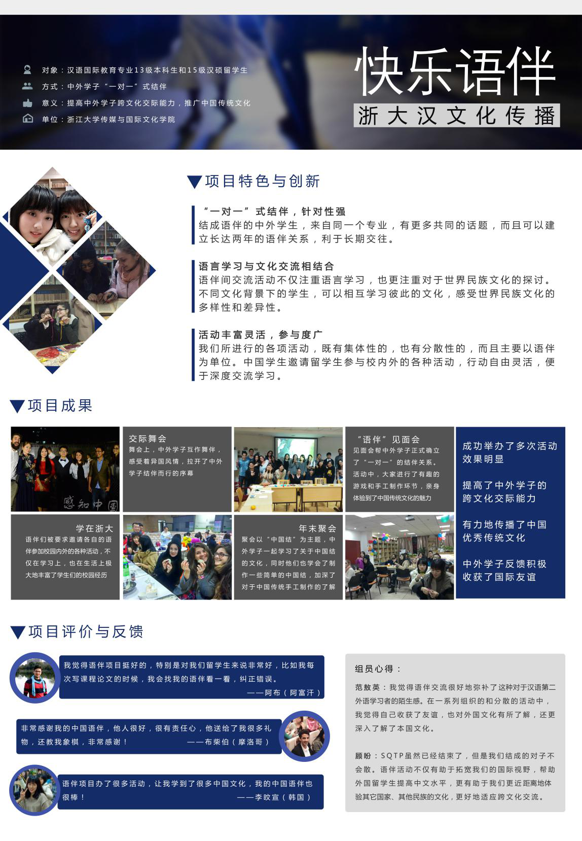 “快乐语伴”作为SQTP的一个项目,其成员是由浙大传媒与国际文化学院汉语国际教育专业的本科生和汉硕留学生组成,学生参与数量较多,活动形式灵活,现实意义重大。所以该项目在申报之后,便得到了学院的肯定和重视,被推荐为SQTP的重点项目之一。