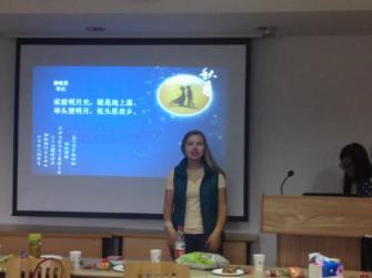 “举头望明月,低头思故乡”,乌克兰留学生尔家用流畅的汉语吟诵诗词,拉开了茶话会的序幕。随后,李颢同学带领大家一起吟读了《玉阶怨》、《中秋望月》等具有代表性的中秋诗词,并解释了这些诗词所蕴含的深厚意蕴,外国学生更加深刻地体会与领略到了中华传统文化的魅力。