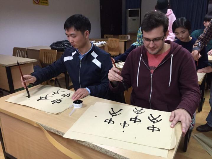 在活动的最后阶段,也是最精彩的部分,结合同学们的专业,江老师教同学们写了篆体的“中文”两个字,大家都兴致盎然地练习起来。