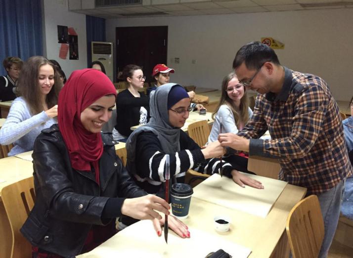 写好毛笔字的第一步就是掌握正确的坐姿、握笔的姿势。中外同学按照老师的要求拿起手中的笔,收腹挺胸,端正坐姿。而后江老师给予一一指导,做好写字的第一步。