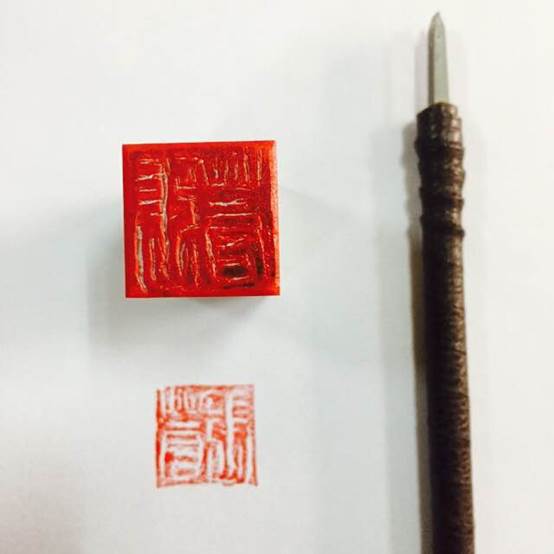 课堂体验活动开始时,徐老师简单介绍了篆刻艺术的起源,从“印宗秦汉”降到了赵孟頫的印章变法,篆刻艺术逐渐与书写性艺术融合到一起;最后介绍了西泠印社社长吴昌硕大刀阔斧将强烈的写意性融入到篆刻当中。紧接着徐老师详细介绍了篆刻的操作方法,本次主要是临摹字体进行阴文篆刻。首先拿到印石后,用“8”字法打磨印石,这种方法使印石各个面都比较均匀;其次,用拷贝纸覆盖于需要篆刻的文字之上并用毛笔进行临摹,描黑色部分。最后将拷贝纸覆于印石之上,用水沾湿拷贝纸,使墨显于印石之上,最后便是拿起刻刀篆刻。在认真仔细地完成准备工作后,同学们跃跃欲试,拿起手中的刻刀,小心翼翼又聚精会神地雕刻自己的作品。在此期间,老师不断对学生进行指导,并提醒学生用无名指抵住印石,小幅度小范围地进行刻画,这样能够避免对手造成伤害。同学们一个个屏气凝神,用心经营着自己的方寸世界,午后阳光正好,时间一寸寸流逝,同学们手中的方寸世界也逐渐清晰,向大家展示着独特的魅力。