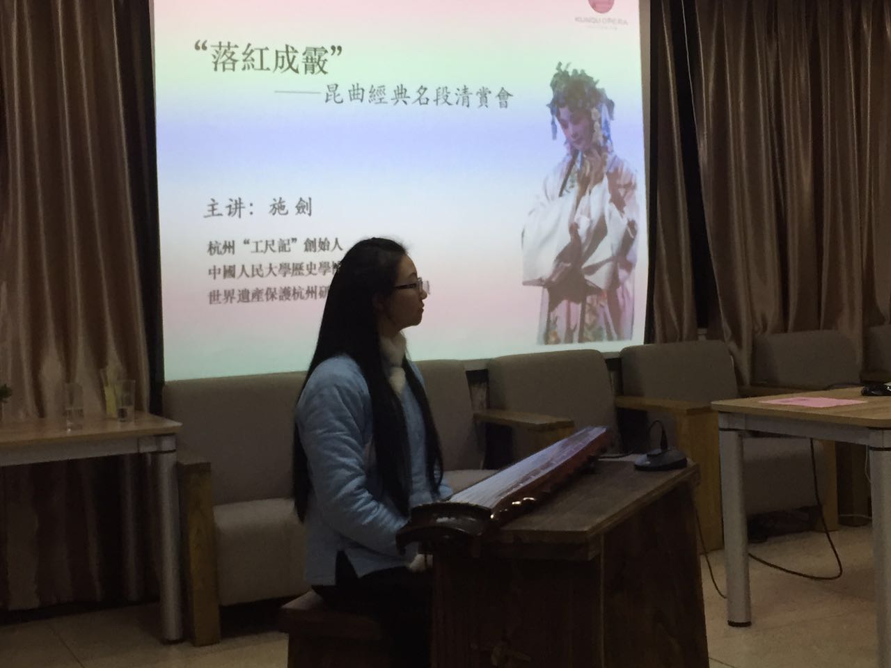 开场是由施剑博士带领的“工尺记”乐队为大家演奏由昆曲曲牌音乐改编的序曲,用箫、琵琶和扬琴让大家初步领略到了中国古典乐器的魅力。接着施剑博士为大家讲解了作为“百戏始祖”的昆曲的由来——将南曲伴奏所用的箫、笛等管乐器与北曲伴奏所用的琵琶等弦乐器完美地结合在一起,使昆曲唱到情思细腻之处可温婉,需要表现激烈情绪时也可高昂。接着施剑博士声情并茂地介绍了昆曲名作——《牡丹亭》的大致内容,并摘取其中最具代表性的缘起、脱尘两个部分,由“工尺记”伴奏,曲社的莲花老师演唱和表演,将这部经典之作中的四节——《牡丹亭·惊梦》之[步步娇]、《牡丹亭·惊梦》之[皂罗袍]、《牡丹亭·寻梦》之[懒画眉]、《牡丹亭·幽媾》之[宜春令],一一呈现在大家眼前。