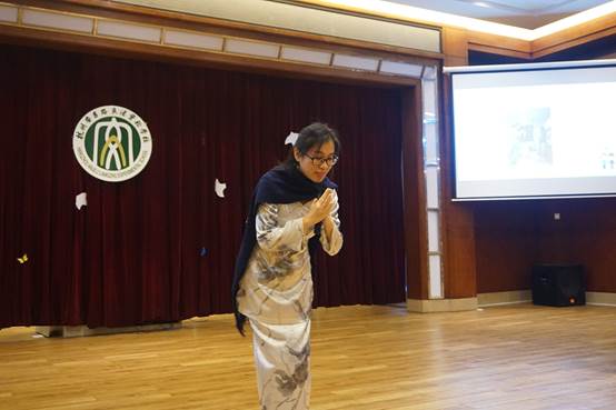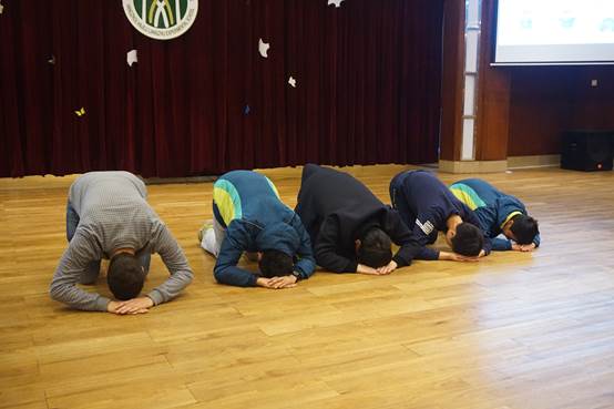来自马来西亚的留学生志愿者身穿她们国家的传统服饰,隆重出场。孩子们一起学习了她们国家的摸手礼仪、餐桌礼仪和饮食习惯、送礼习惯等等,大声惊呼开眼界。韩国留学生志愿者与大家一起现场实践问候礼仪,尤其是拱手法,所有的老师、学生和家长一同做拱手礼的场面十分震撼。