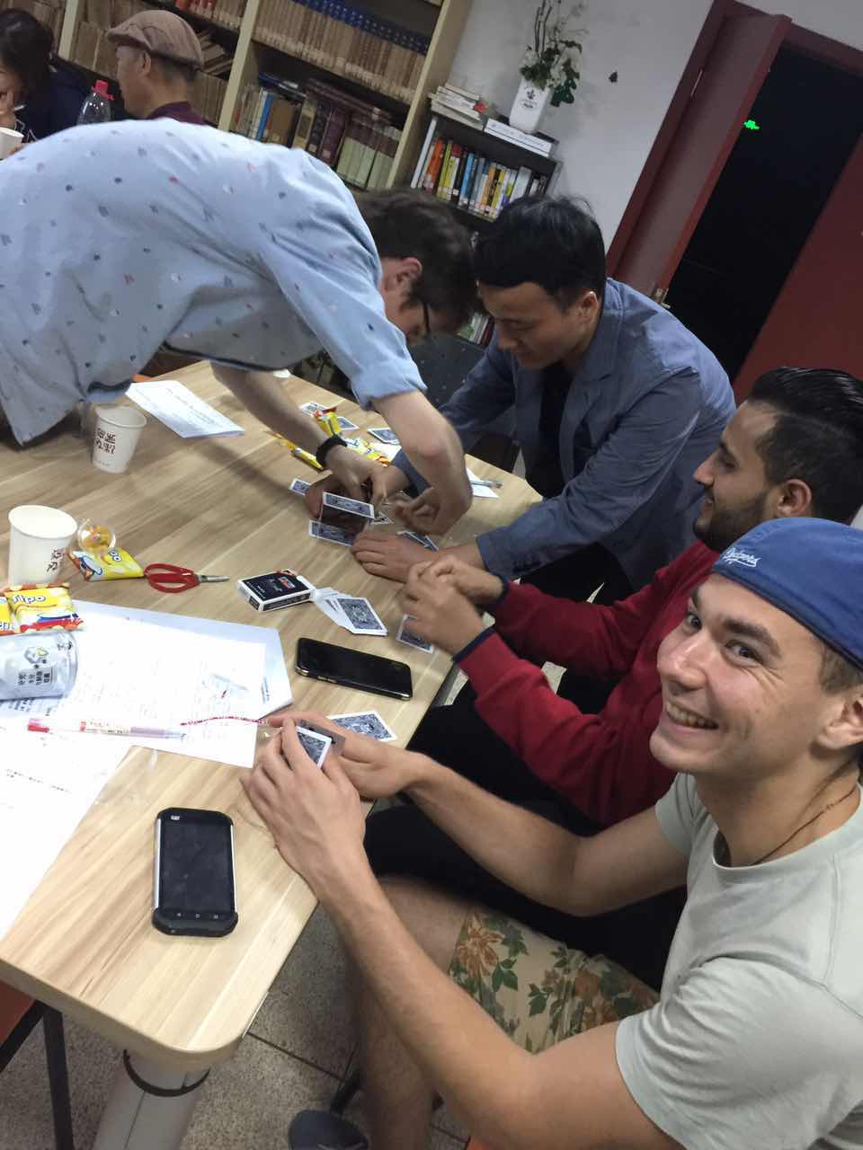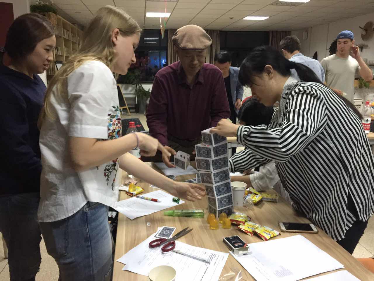 本期汉语角的高潮环节就是最后的游戏环节了。主持人组织大家用一副扑克牌搭一座高楼,在限定时间里,看哪一组可以搭得最高。外国朋友和中国朋友齐心协力,都想出了很好的方法,让本组的高楼搭得又高又稳。