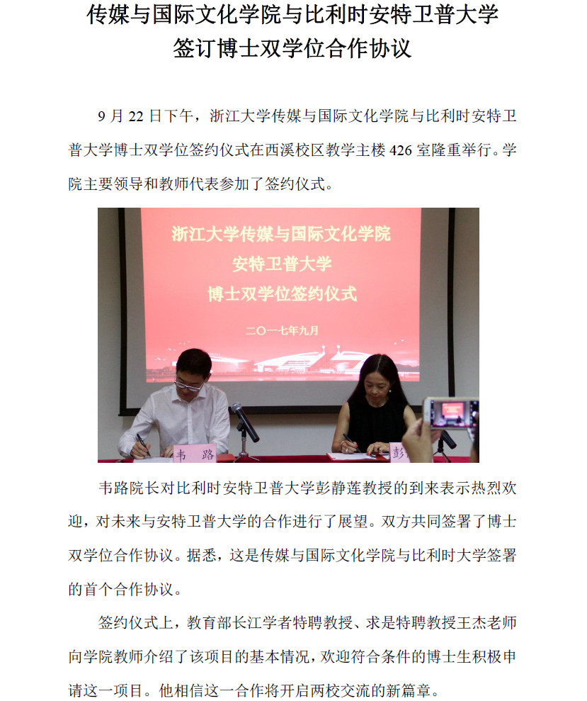 传媒与国际文化学院与比利时安特卫普大学 签订博士双学位合作协议