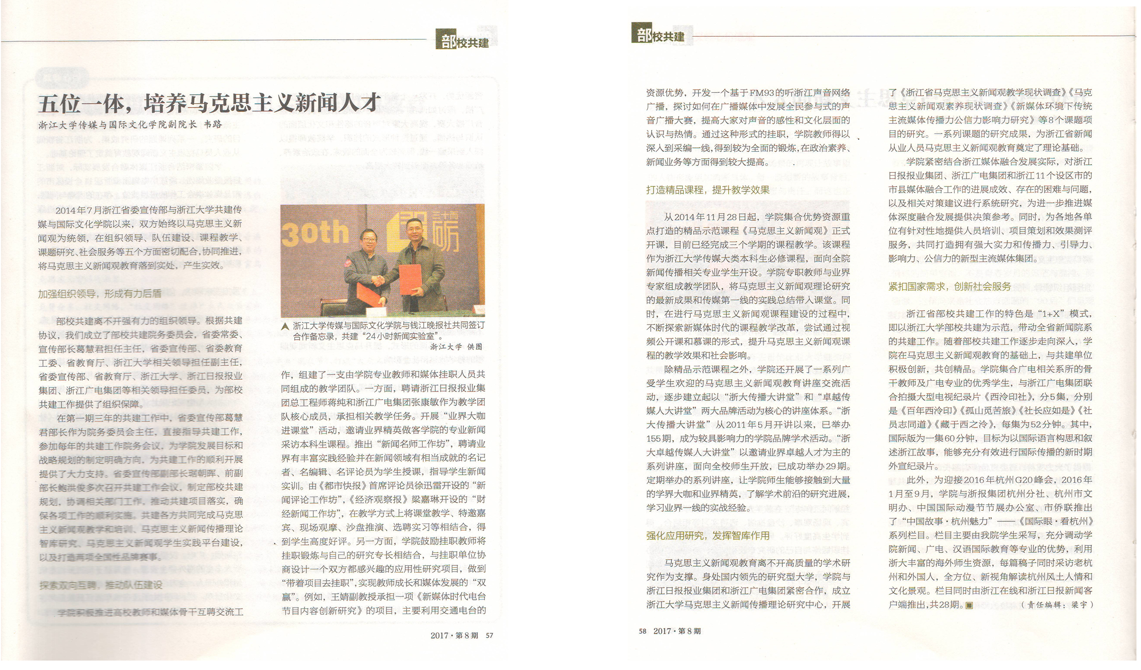 自2014年部校共建以来,根据协议,双方成立了部校共建院务委员会,以马克思主义新闻观为统领,启动马克思主义新闻观教育工程,整合浙江日报报业集团、浙江广电集团的资源,成为浙江省马克思主义新闻观学术研究中心和教学培训基地。传媒学院专门设置了“马克思主义新闻观”课程,并实施多项配合马克思主义新闻观教育专门组织的社会实践活动,为提升学生党员理论与实践整体素质提供制度保障。同时,共建单位在组织领导、队伍建设、课程教学、课题研究和社会服务等五个方面密切配合,将马克思主义新闻观教育落到实处,产生了实效。接下来,传媒学院将积极筹建“马克思主义新闻传播理论研究中心”,并申报省重点研究基地,进一步深入探索马克思主义新闻观教育的培养模式。