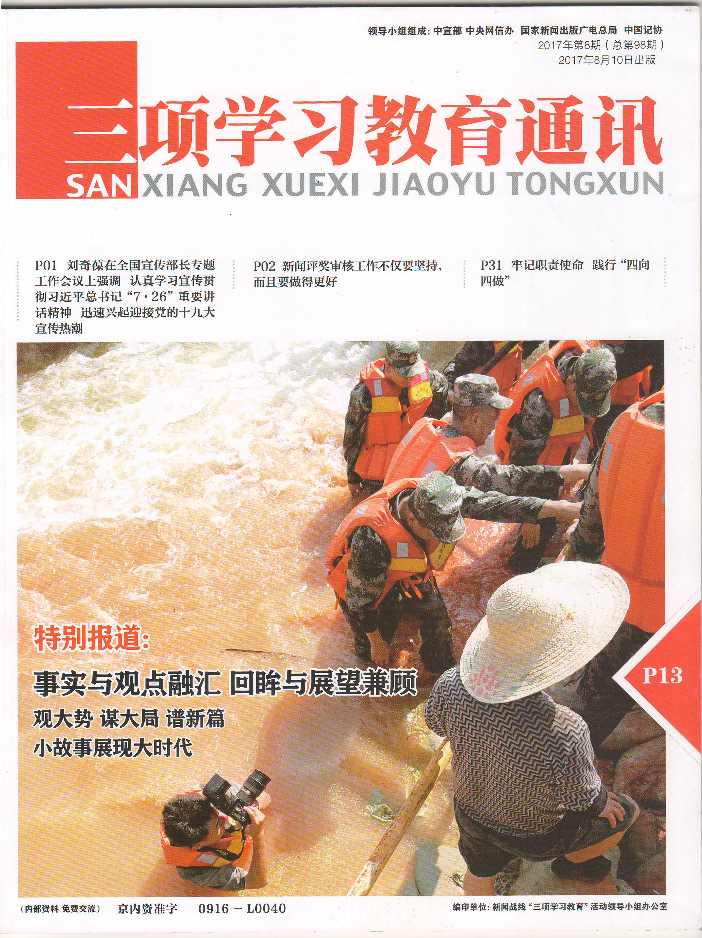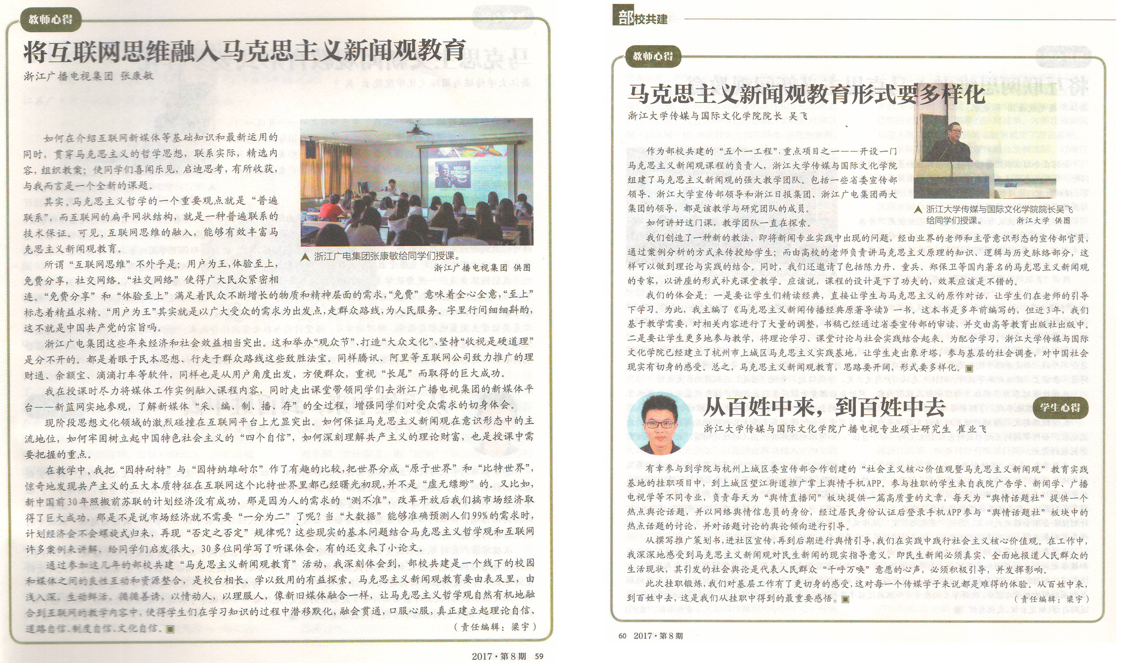 近日,中央《三项学习教育通讯》在2017年第8期刊发了由浙江大学传媒与国际文化学院院长韦路教授撰写的以“五位一体,培养马克思主义新闻人才”为题的文章,该文主要着重介绍了浙江省委宣传部与浙江大学共建传媒与国际文化学院的相关经验和成效。同期还刊登了部分师生心得体会,其中包括浙江广播电视集团教授级高工张康敏老师的“将互联网思维融入马克思主义新闻观教育”、传媒与国际文化学院吴飞教授的“马克思主义新闻观教育形式要多样化”以及传媒与国际文化学院硕士研究生崔业飞的“从百姓中来,到百姓中去”等文章,结合马克思主义新闻观课程教学情况,深入介绍了自己的切身感受。