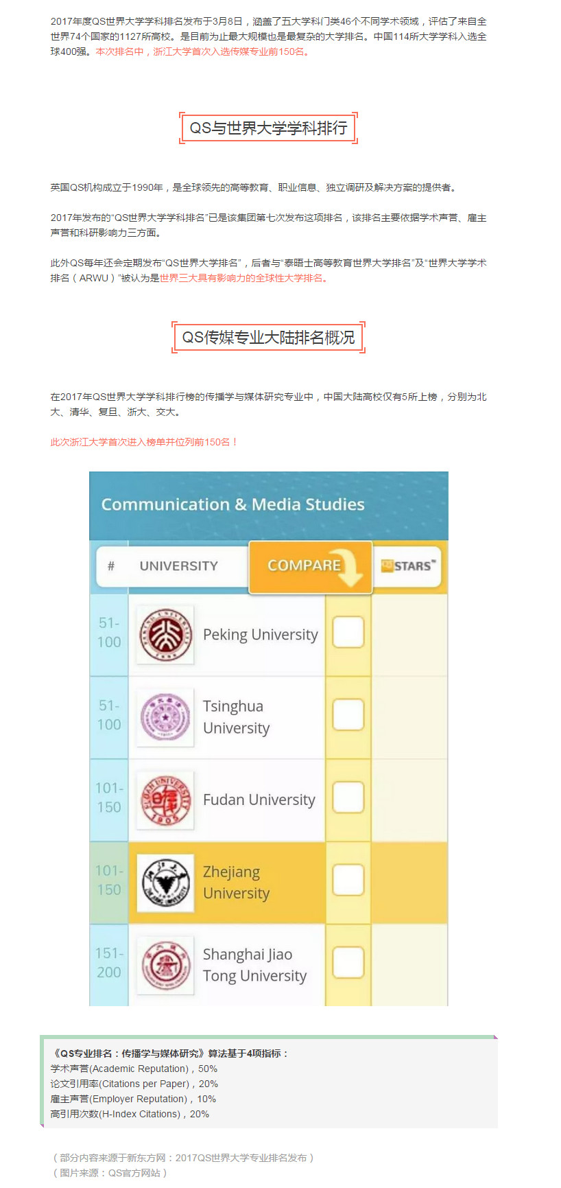 2017QS世界大学学科排行榜:浙大首进传媒专业前150名!