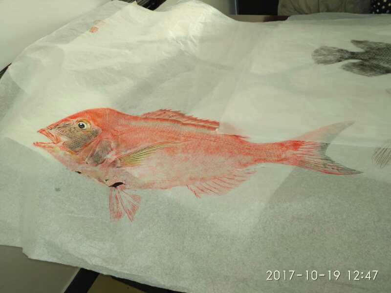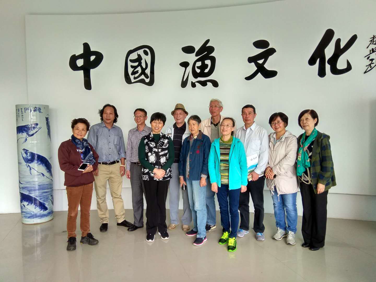 中午,伊建新就在他和朋友们一起创建的中国渔文化实践基地招待我们,并陪同大家参观了基地内的中国渔文化展示馆、盛欣夫鱼瓷馆、工艺大师朱利勇竹根雕馆和渔文化书画社。其中的鱼拓画引起老师们的浓厚兴趣。伊建新介绍说,这是他们中国渔文化实践基地的一个创新,先把颜料涂满鱼身,再把宣纸覆盖在鱼上,就产生了一幅栩栩如生的鱼拓画。这种鱼拓画因为参与性很强,所以最受中小学生及其家长的喜爱。