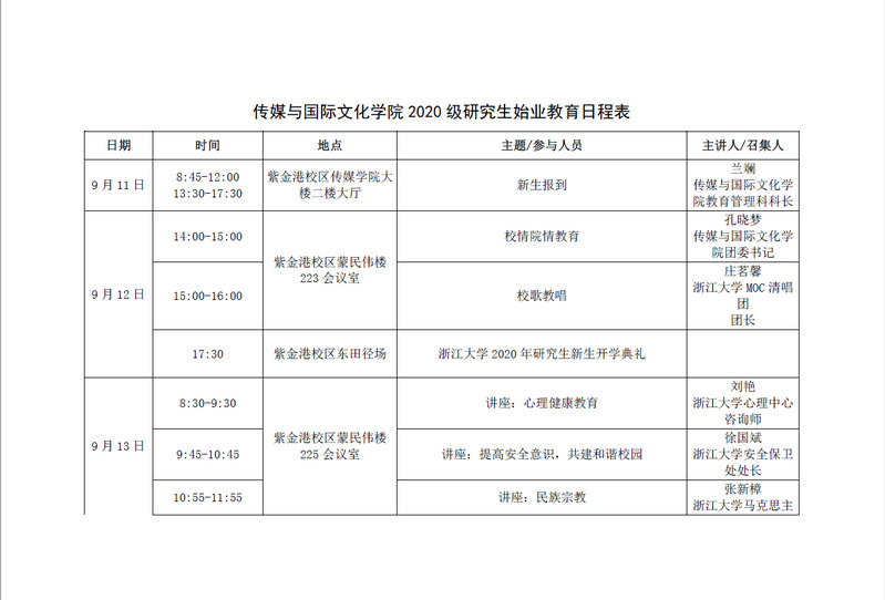 附件:传媒与国际文化学院2020级研究生始业教育日程表.pdf