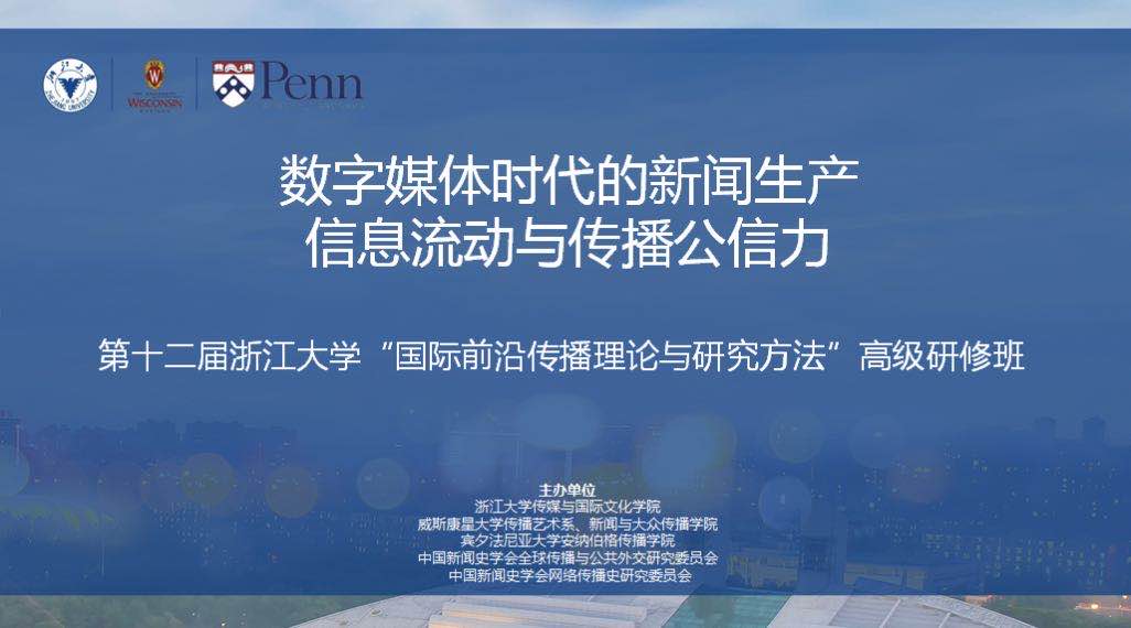 本届暑期研修班的主题是“数字媒体时代的新闻生产、信息流动与传播公信力”, 由浙江大学、威斯康星大学、宾夕法尼亚大学、中国新闻史学会全球传播与公共外交委员会和中国新闻史学会网络传播史委员会联合主办。在往年“海内外名师授课”+“论文研讨”的基础形式上,组委会充分考虑到线上交流的特点,增设了主题互动的环节,希望老师、学员可以突破地理空间的局限,在线上开展丰富多彩的学术交流,深入探讨数字媒体与新闻创新等领域的前沿理论、概念、方法,促进各位学人对相关学术议题的思考与对话。