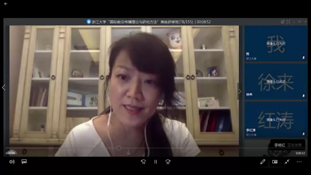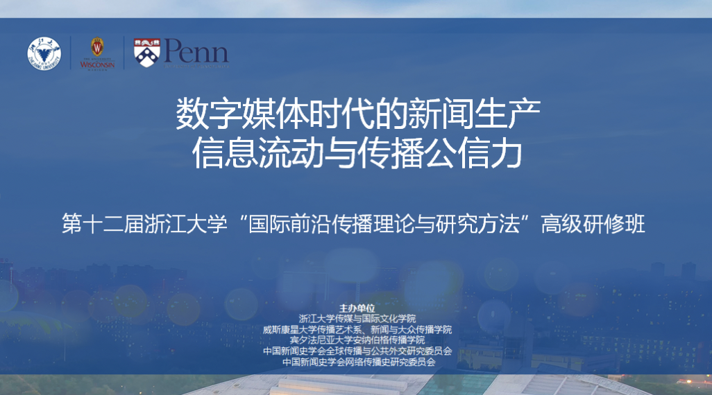 2020年7月6日至10日,第十二届浙江大学“国际前沿传播理论与研究方法”高级研修班于线上成功举办。本届研修班由浙江大学、威斯康星大学、宾夕法尼亚大学、中国新闻史学会全球传播与公共外交委员会和中国新闻史学会网络传播史委员会联合主办。多位海内外学术大咖和一百五十余名青年学者汇聚云端,围绕 “数字媒体时代的新闻生产、信息流动与传播公信力”的主题,通过海内外名师授课、学员分组讨论、学员汇报展示和圆桌讨论等多种形式展开线上交流。