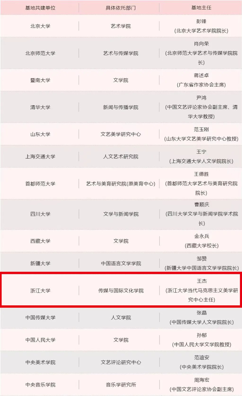8月1日,中国文艺评论家协会公布第二批中国文艺评论基地名单,浙江大学再次入选基地共建单位,具体依托部门为传媒与国际文化学院,基地主任为浙江大学“求是”特聘教授王杰。