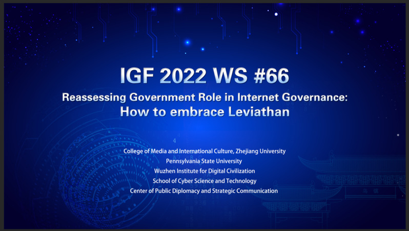 11月29日,由浙江大学传媒与国际文化学院、公共外交与战略传播研究中心、乌镇数字文明研究院和美国宾夕法尼亚州立大学成功申办的工作坊——IGF 2022 “重估政府在网络治理中的角色:如何拥抱利维坦”举办。全球著名网络治理专家学者和各国代表汇聚一堂,以线上和线下相结合的方式,针对后疫情时代政府在全球网络治理中的新角色、新使命和新定位,展开了热烈讨论。本次研讨会由联合国教科文组织专家胡献红博士主持。