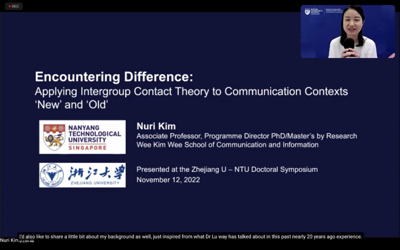 开幕致辞后,研讨会正式拉开帷幕。浙江大学林健老师主持了第一位演讲嘉宾南洋理工大学副教授Nuri Kim题为“Encountering Difference: Applying Intergroup Contact Theory to Communication Contexts ‘New’ and ‘Old’”的线上演讲。