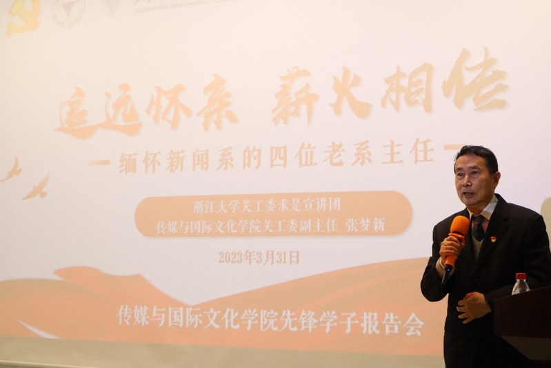接着,张梦新老师引用唐代诗句“芳林新叶催陈叶,流水前波让后波”简要介绍了四位老系主任之后为新闻系作出贡献的部分老师们,并且提出希望,传媒学子们要怀抱理想、脚踏实地,敢想、敢为、善作善成,让青春在浙大建设中国特色一流大学的进程中留下无悔的奋斗痕迹!