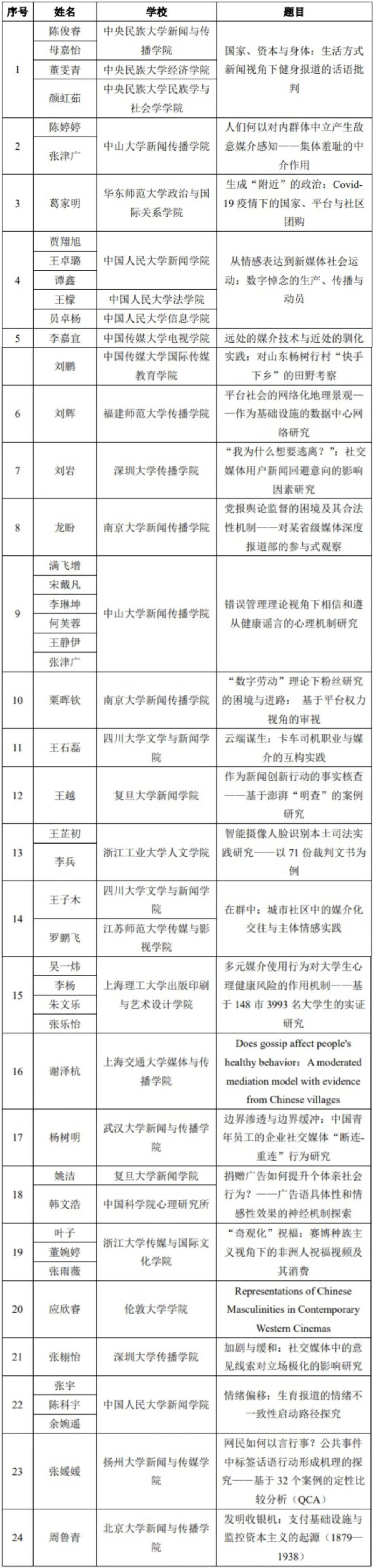 2023年4月22日,由安徽大学新闻传播学院、南京大学新闻传播学院、浙江大学传媒与国际文化学院、中国人民大学新闻学院和中山大学新闻传播学院五校联合发起的第四届新闻传播学研究生“青梅论坛”将在浙江大学传媒与国际文化学院举办。承蒙诸位青年学人的厚爱,经过近一个月时间的征稿,论坛共收到海内外作者的有效投稿329篇。经过会议主办方基于基本学术规范和研究论文必备要素的初审,共有187篇稿件进入复选。将全部稿件匿名处理后,文章的遴选完全遵循双向匿名的原则进行同行评议。复选环节,由6名评审专家以百分制评分,最终取排名前24名的稿件入选本次论坛,入选率为7.29%。目前具体入选论文名单如下(按第一作者姓名拼音排序,如有放弃会议宣读者将按排名顺序依次递补):