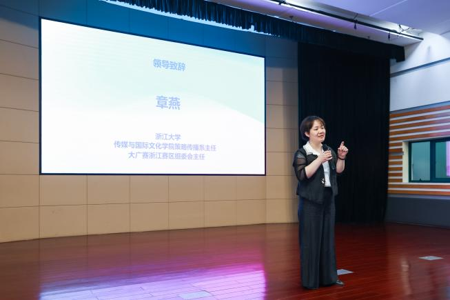 浙江大学传媒与国际文化学院策略传播系主任、大广赛浙江赛区组委会主任章燕老师在回顾了浙江赛区在去年取得的优异成绩后,分享了第14届大广赛的规则和注意事项,尤其是在“创意我百变”的赛事主题下,组委会会严查抄袭,尊重知识版权。同时,呼吁学生们继续创作出更好的作品。