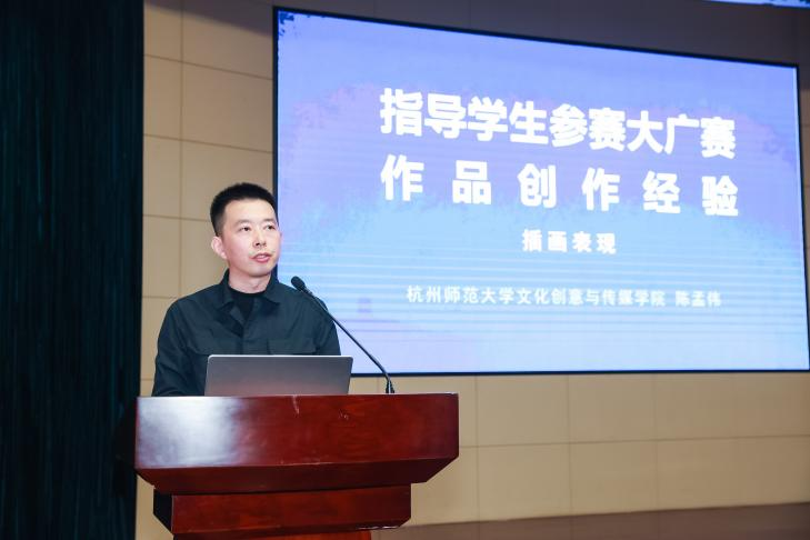 为了能够促进深度交流,让更多的院校师生在大广赛中获益学习,活动邀请了本届比赛中取得突出成绩的优秀指导教师作经验分享。杭州师范大学文化创意与传媒学院副教授陈孟伟老师率先发言,他提到,师生共同的努力和成长才是最好的教学相长,应该指导学生做好规划,以过来人的经验为学生提供相应的指导。他抛出疑问 “创意层面不那么优秀的作品怎样提升质量?做到优质水平?”引发了在场参会人员的思考,同时结合亲身经历,分享了其思考过程。